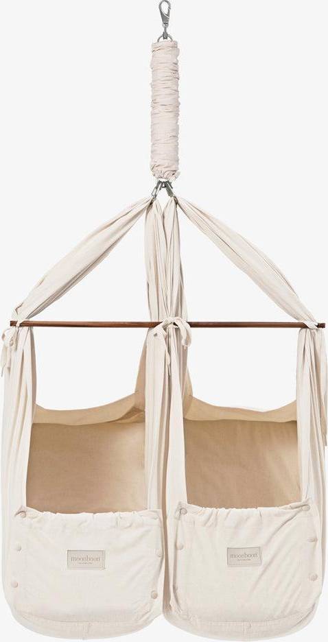 Tvillingeslyngevuggen fra Moonboon er fremstillet i 100% økologisk og GOTS-certificeret bomuld, som giver et sundt og åndbart sovemiljø. De to separate kapokmadrasser former sig nænsomt efter børnenes kroppe og skaber en stabil, støttende flade, der fremmer dybere hvile.