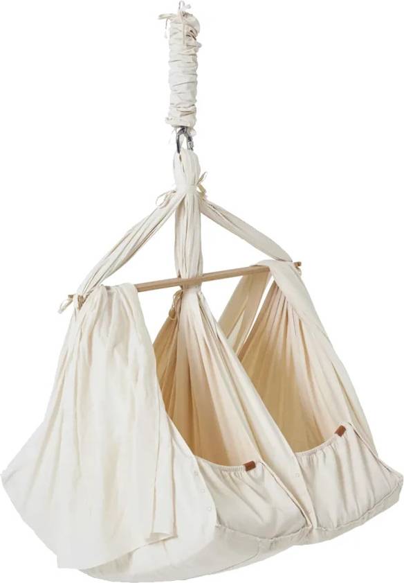 En slyngevugge fylder meget lidt og kan hænges op i loft, karm eller stativ. Den kan let flyttes mellem rum, så babyen altid kan sove tæt på forældrene i hverdagen.