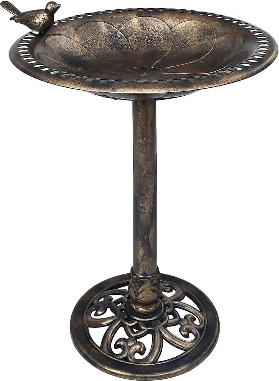 Det detaljerede design med fine ornamenter og en lille fuglefigur på kanten tilfører både charme og personlighed. Den kompakte størrelse gør det nemt at finde plads til, også hvis du kun har en mindre altan eller en diskret krog i haven. Et lille sted med stor betydning for både dyr og stemning.