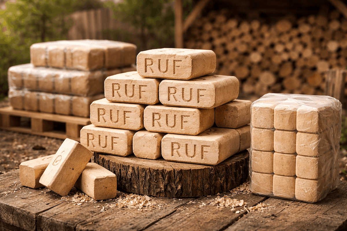 Når du vælger Ruf træbriketter, får du leveret en palle med 96 poser á cirka 10 kg, der er fremstillet af 100 procent nåletræ. Briketterne består af hårdtpresset fyr og gran, hvilket giver en ensartet kvalitet og en stabil forbrænding i din brændeovn.