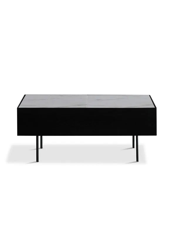 Det sorte, lakerede metalstel danner en stilren kontrast til den lyse marmor og fremhæver bordets geometriske form. Kombinationen af materialer giver et afbalanceret design, hvor enkelhed og kvalitet går hånd i hånd, perfekt til moderne og tidløse hjem.